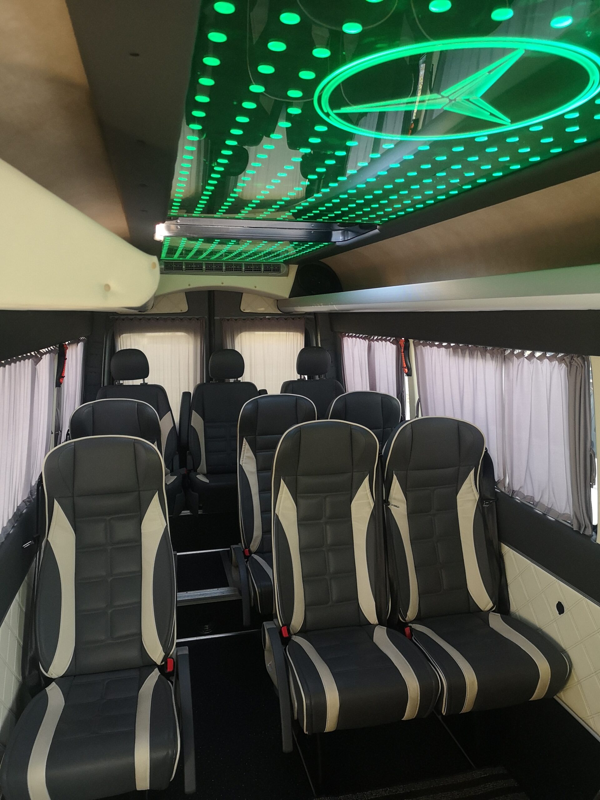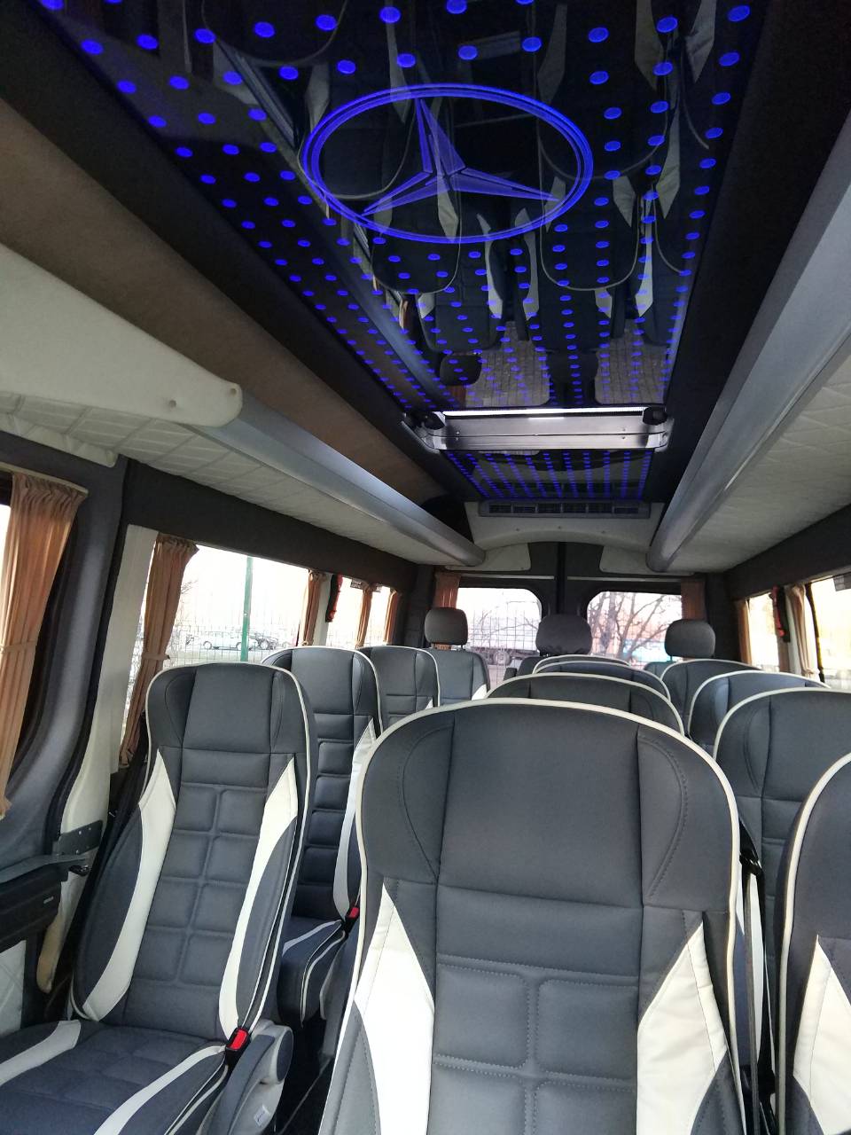 В салоне установлены комфортные, удобно раскладывающиеся ортопедические сиденья, над ними расположены вместительные полки для ручной клади. В задней части имеется вместительный багажный отсек. Особенный комфорт салону придает мягкая пневмоподсветка микроавтобуса, а также ночная неоновая подсветка высокого потолка.